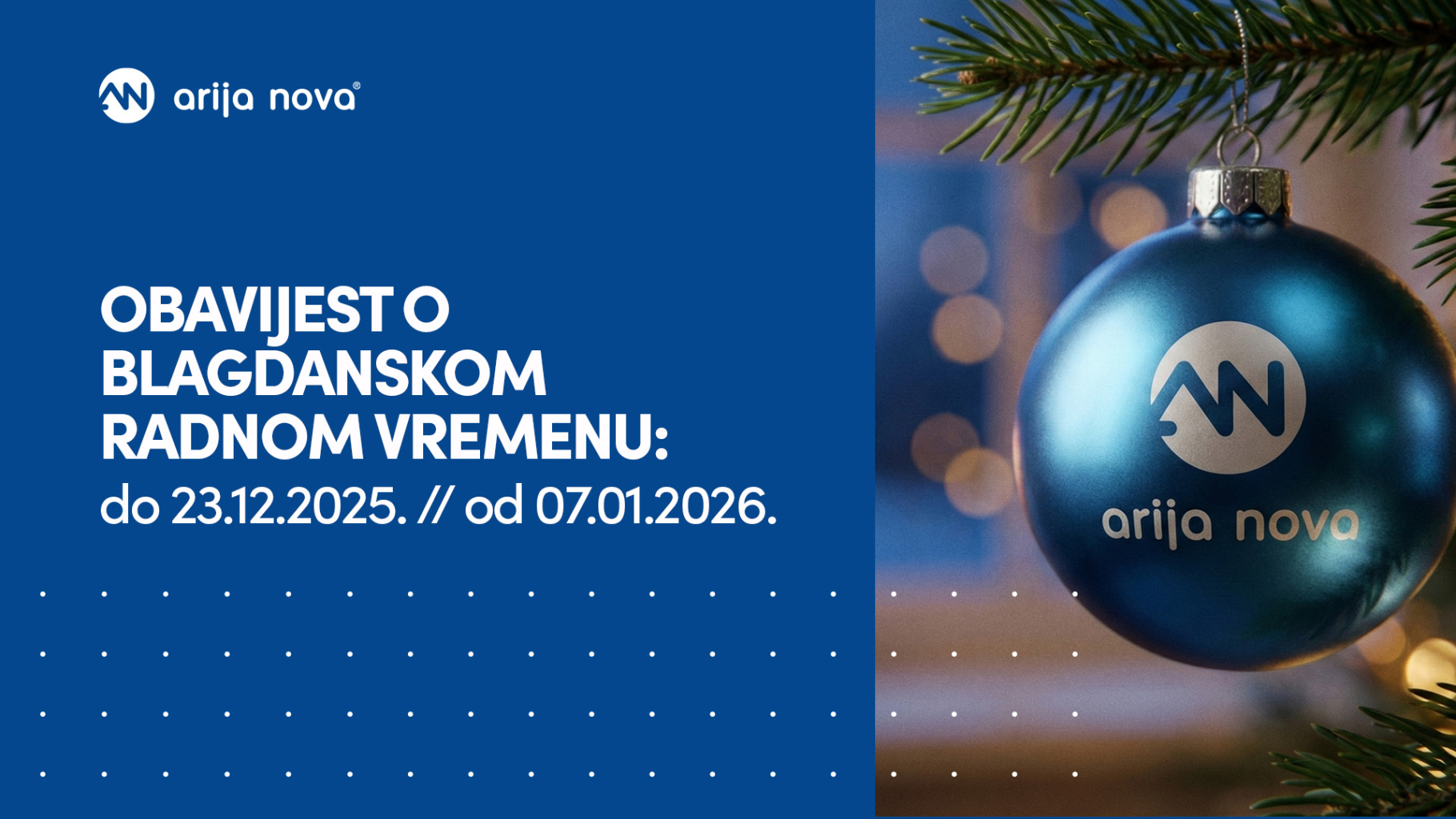 u susret božićnim i novogodišnjim blagdanima želimo vas obavijestiti o izmijenjenom radnom vremenu tvrtke Arija Nova d.o.o., kao i iskoristiti ovu priliku da vam zahvalimo na povjerenju i suradnji tijekom protekle godine.